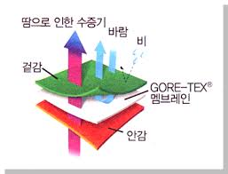 - 특징: 외부의 물은 막고 내부 수증기는 배출 → 쾌적한 착용 유지