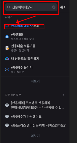 - 홈 하단 전체 메뉴진입, 상단 검색창에 신용회복 대상자 입력