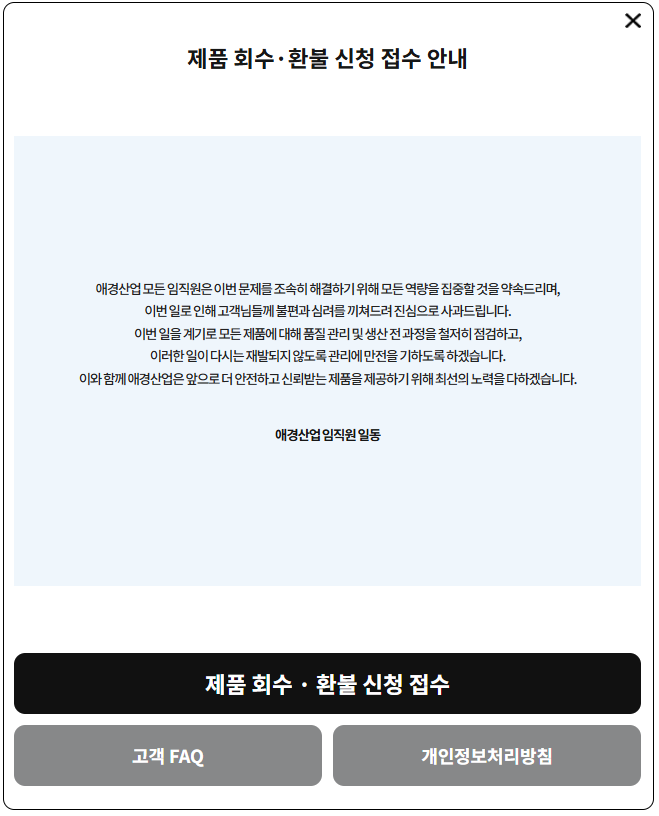 - 애경산업 홈페이지 접속 → ‘제품 회수·환불 신청’ 클릭