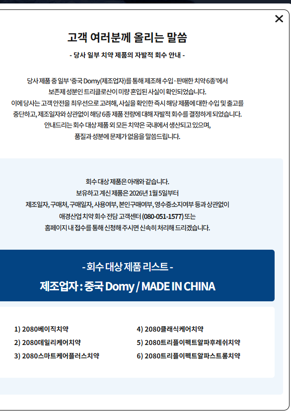 애경산업은 이번 회수 제품은 중국 위탁 생산 제품에 한정되며, 국내에서 생산된 2080 치약은 안전하다고 공식 발표했습니다.